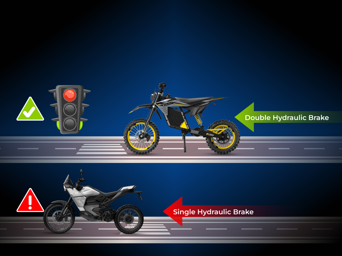 The front and rear Dual-Piston hydraulic brakes enable you to brake immediately and safely handle steep hills, muddy paths, and sudden obstacles