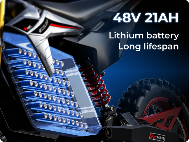 Stop checking your battery anxiety at the door. The Conqueror X is equipped with a massive 48V 21Ah (20800mAh) Automotive-Grade Lithium Battery. Integrated with a smart BMS for safety, it delivers a real-world range of 50-60 miles per charge.